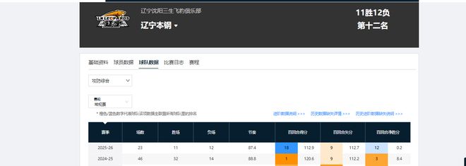 上赛季常规赛,辽宁男篮百回合得分120.3,该数据高居联盟第一;本赛季第一阶段过后,他们的百回合得分只有112.9,该表现已降至联盟第18。