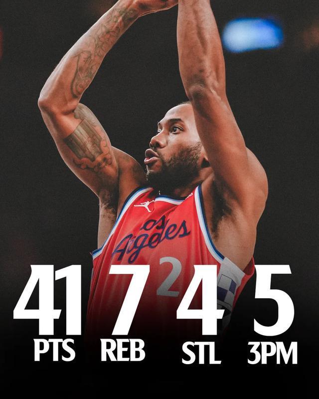 全场比赛,伦纳德出场33分钟30投14中,三分11中5、罚球10中8砍下全场最高41分外加8篮板2助攻4抢断。