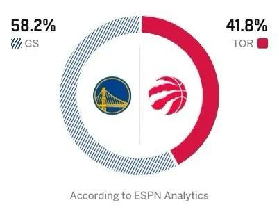 反观猛龙,上一场负于奇才,近13场比赛仅取4胜,目前以18胜14负排在东部第五。球队本赛季整体表现尚可,同样以防守见长,进攻表现一般。阵容方面他们锋线储备深厚,但首发与替补实力存在断层,轮换阶段往往陷入被动。ESPN数据模型对此役两队胜负概率进行预测:勇士胜率58.2% ,猛龙胜率41.8%。