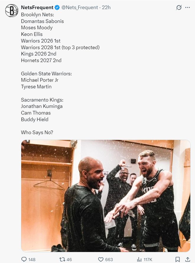 篮网得到:小萨博尼斯、穆迪、埃利斯、勇士2026年首轮签、勇士2028年首轮签(前三保护)、国王2026年次轮签、黄蜂2027年次轮签。