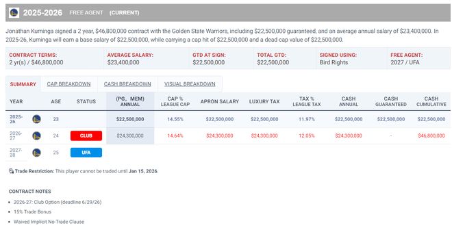 网媒口中的时间问题跟库明加的合同有关,库明加是在新赛季开赛前才跟勇士达成两年4680万(包含15%的交易保证金),所以库明加的合同需要在2026年1月16日后才能被交易,换言之还有四天解禁,双方就是在等这个解禁的日子。