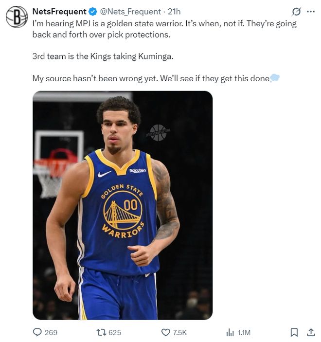篮网媒体NetsFrequent则透露:我听说小波特已经是勇士成员之一,交易不是问题时间才是,他们正在就选秀权进行讨论。交易的第三方是国王队他们会得到库明加,我的消息源从未出过问题,毛片APP一起见证这笔交易的达成吧。